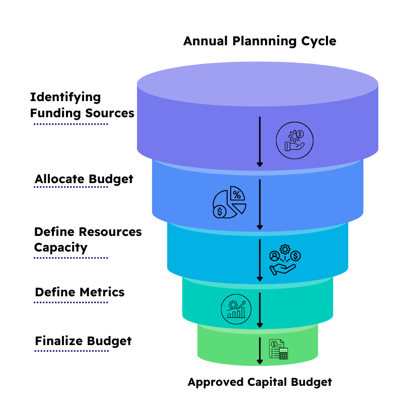 The basic process starts with the annual planning cycle wherein the governance council determines the budget available for capital spend based on funding available from internal and external sources like grants, bonds, etc.