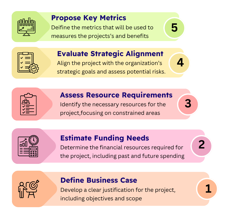 - Submitted projects are collected in a planning portfolio with funds requested, resource requirements, strategic and risk scores, benefits and key metrics.